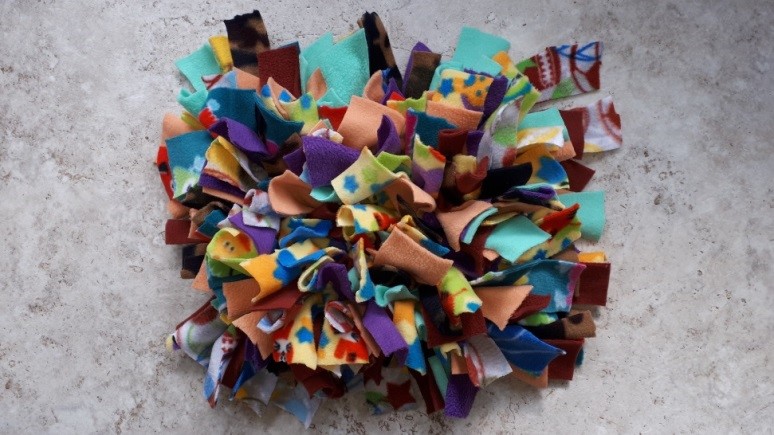 Snuffle mats are simple to make but time consuming. We use donated fleece blankets cut into strips and tie them onto a rubber mat. Scissors, blankets and rubber mats are all the materials needed.