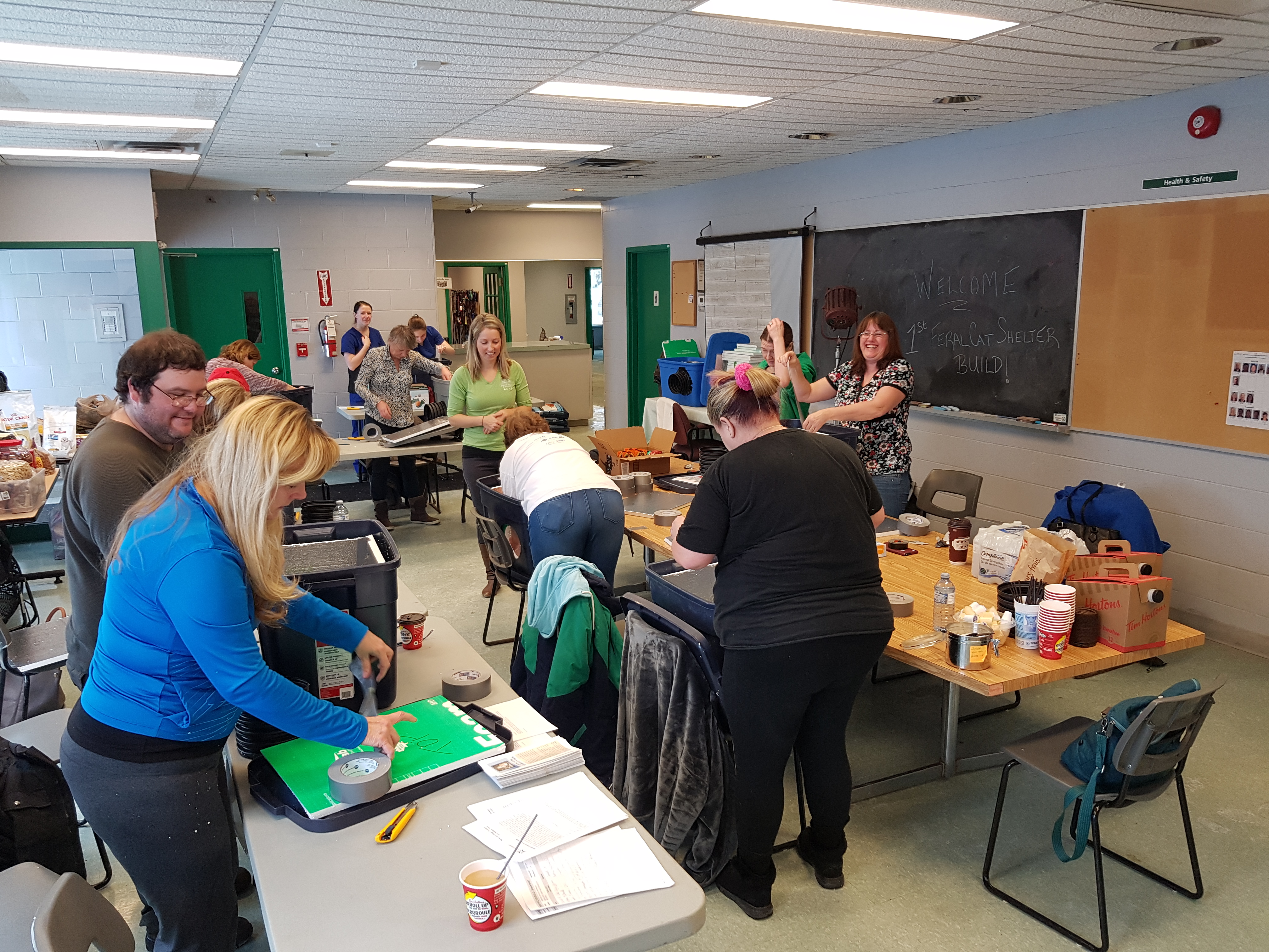 The event was a great success, covering information on feral cats and colonies and instructing attendants on how to build winter cat shelters. There were 15 volunteers who attended, many of whom were already feral cat caretakers in the Oshawa area. In the course of the day the group built 30 shelters for cats in their community.