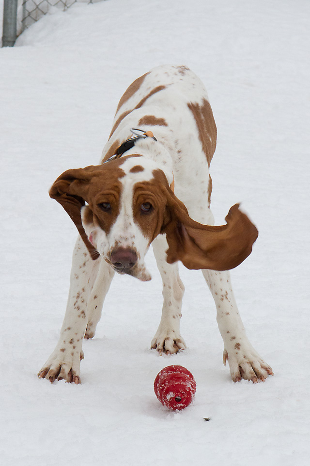 Ice can pose a problem for many reasons. Dogs who are playing or walking on slippery ice can slip and hurt themselves. They can also fall through ice covering deeper bodies of water. Be sure to keep to areas that you know are safe, and consider leash walks to help control dogs who may be excited about playing in the snow.