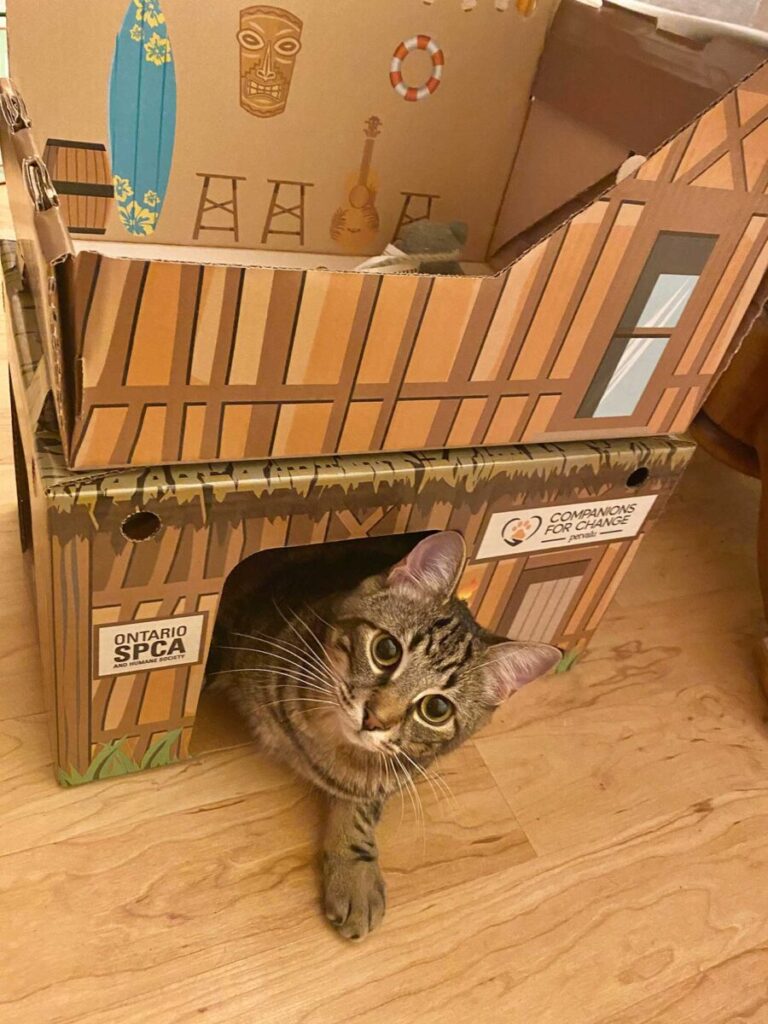 Cat cabins are cardboard box houses that act as a safe haven for cats in our animal centres. When a cat is adopted from the Ontario SPCA, the same “cat cabin” can be transformed into a carrier that the cat can travel home with. Once home, adopters are encouraged to reassemble the cabin, as it has the cat’s scent on it and helps ease their transition into their new home by offering a familiar place to perch, sleep, and hide. This brings a familiar piece of furniture with them, making the transition to a new home easier.