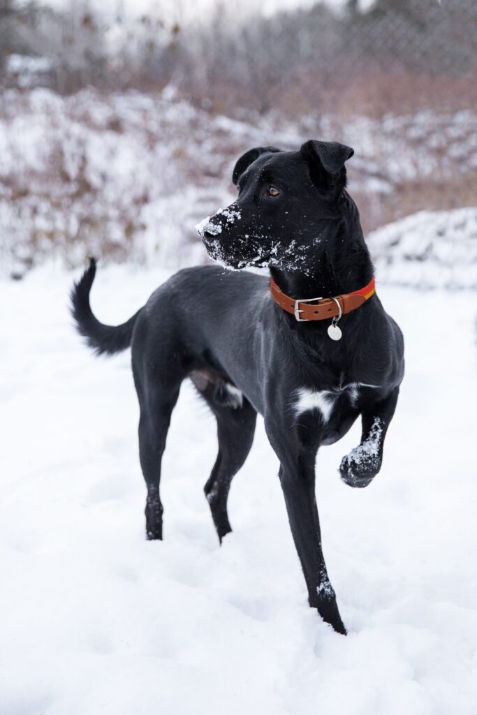 There are many options available for dog boots/shoes. Although it may take your furry friend time to get used to wearing them, a good pair of boots offers warmth, traction on ice and frozen surfaces and protection from salt on the roads or sidewalks. Make sure the boots aren’t too tight and ensure they fit your furry friend properly.