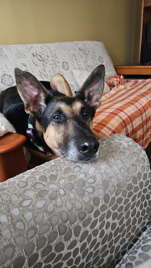 Athena’s antics continue to bring joy and laughter to her new home. She is a lovable dog, seeking comfort from her parents when faced with things that make her nervous.