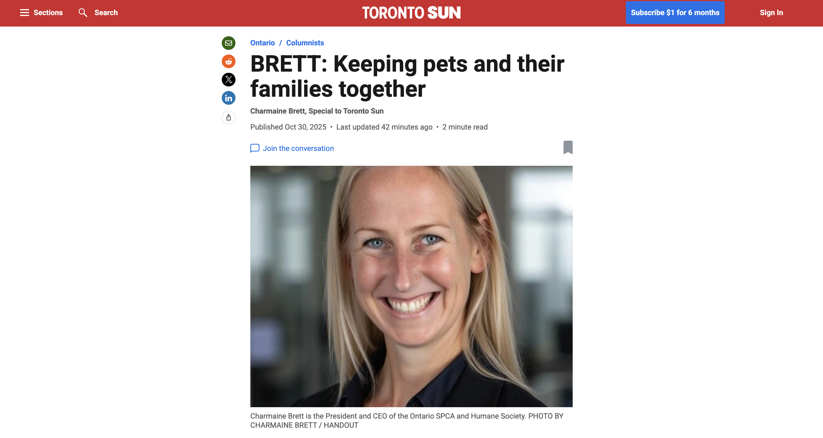 Column by Charmaine Brett published in the Toronto Sun on Oct. 30, 2025