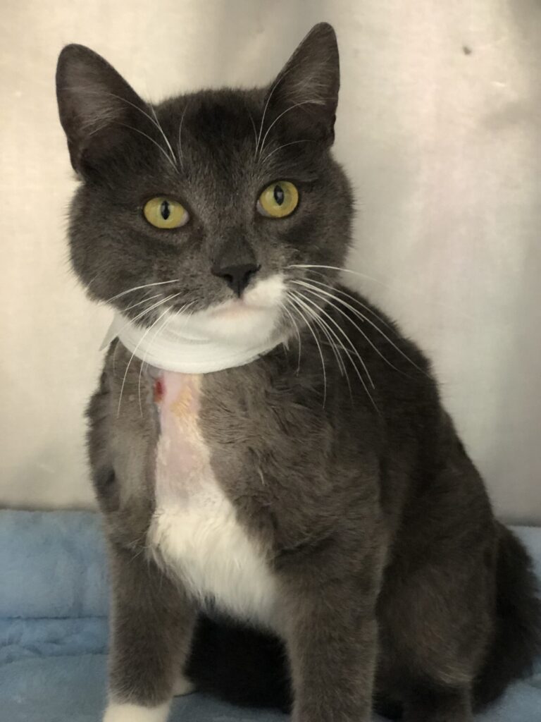 The animal centre team had Leonard promptly examined at a local veterinary clinic. The most serious of injuries were lacerations around this neck, approximately two inches in diameter. He was also dehydrated, underweight and suspected of having neurological issues due to his shaking head and difficulty walking.