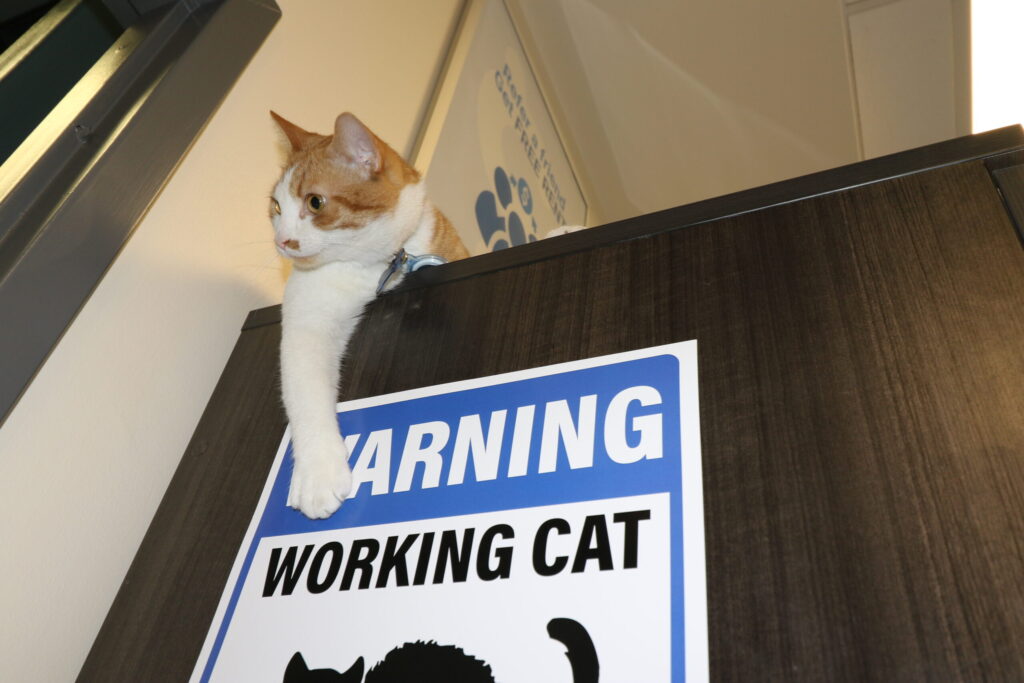 “He definitely livens up the area and makes it a fun experience for a lot of people. And customers do see it as a benefit, homing a cat who otherwise wouldn’t be able to stay in a normal kind of home, and now he actually has a job,” says Morgan.