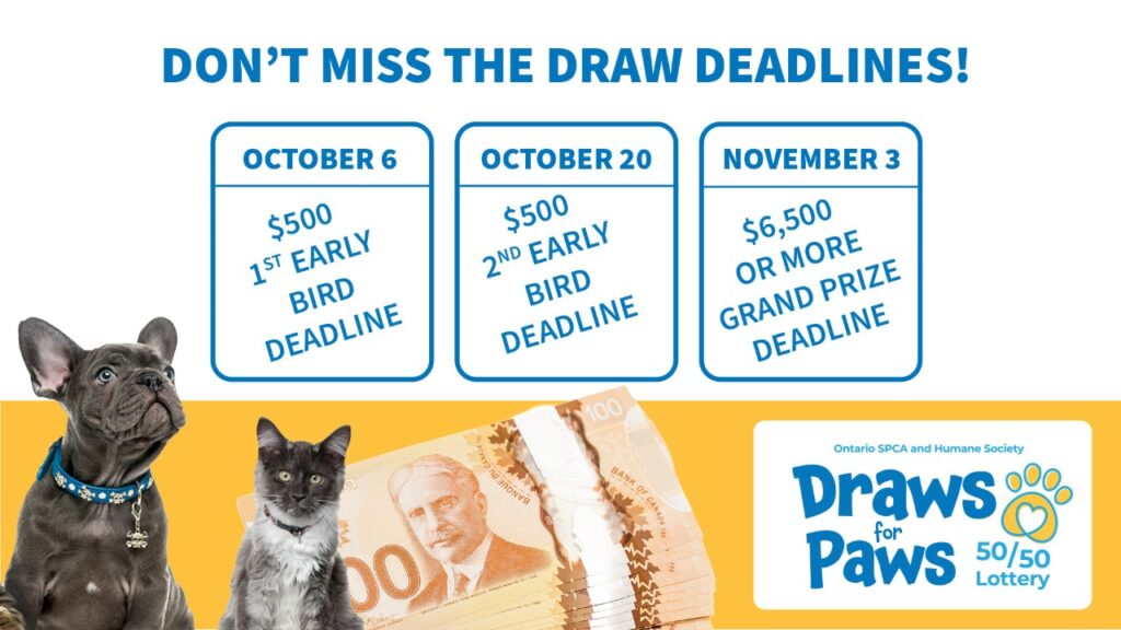The Ontario SPCA and Humane Society is excited to announce the launch of its Draws for Paws 50/50 Lottery, our first ever province-wide 50/50 lottery to raise much-needed funds for animals in need. It’s a rewarding way for people across the province to make a real difference in the lives of animals who need our help – plus, you might just be our lucky grand prize winner!