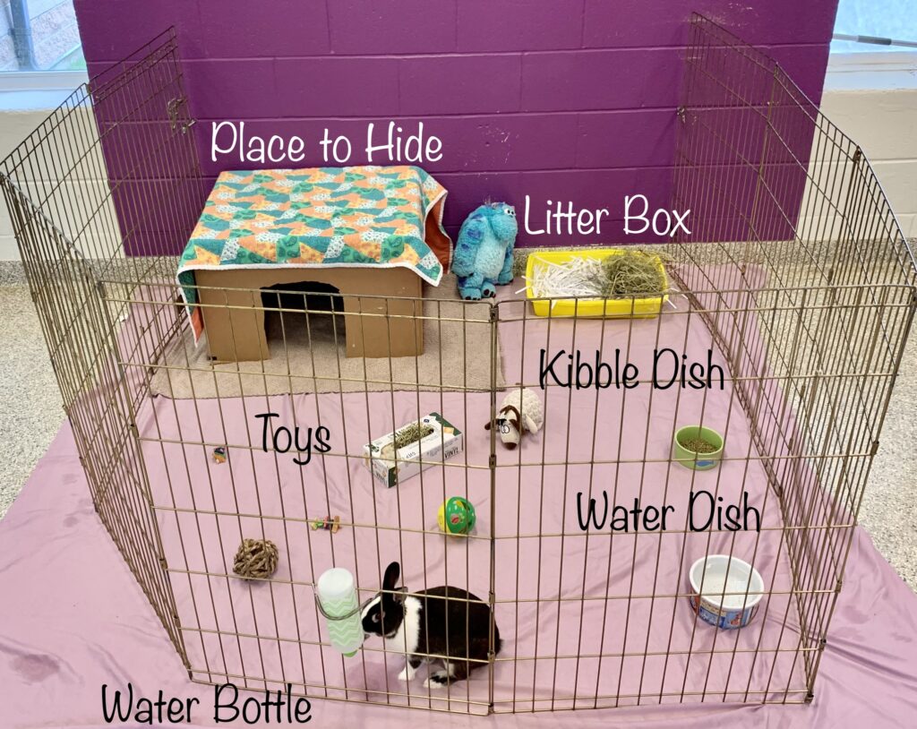 Inside the X-pen are all the things a rabbit will need: A place to hide, a litter box, toys, food dishes and a mounted water bottle. Rabbits can become overweight if they don’t have enough room to move, so an X-pen also allows them space to play and move around.